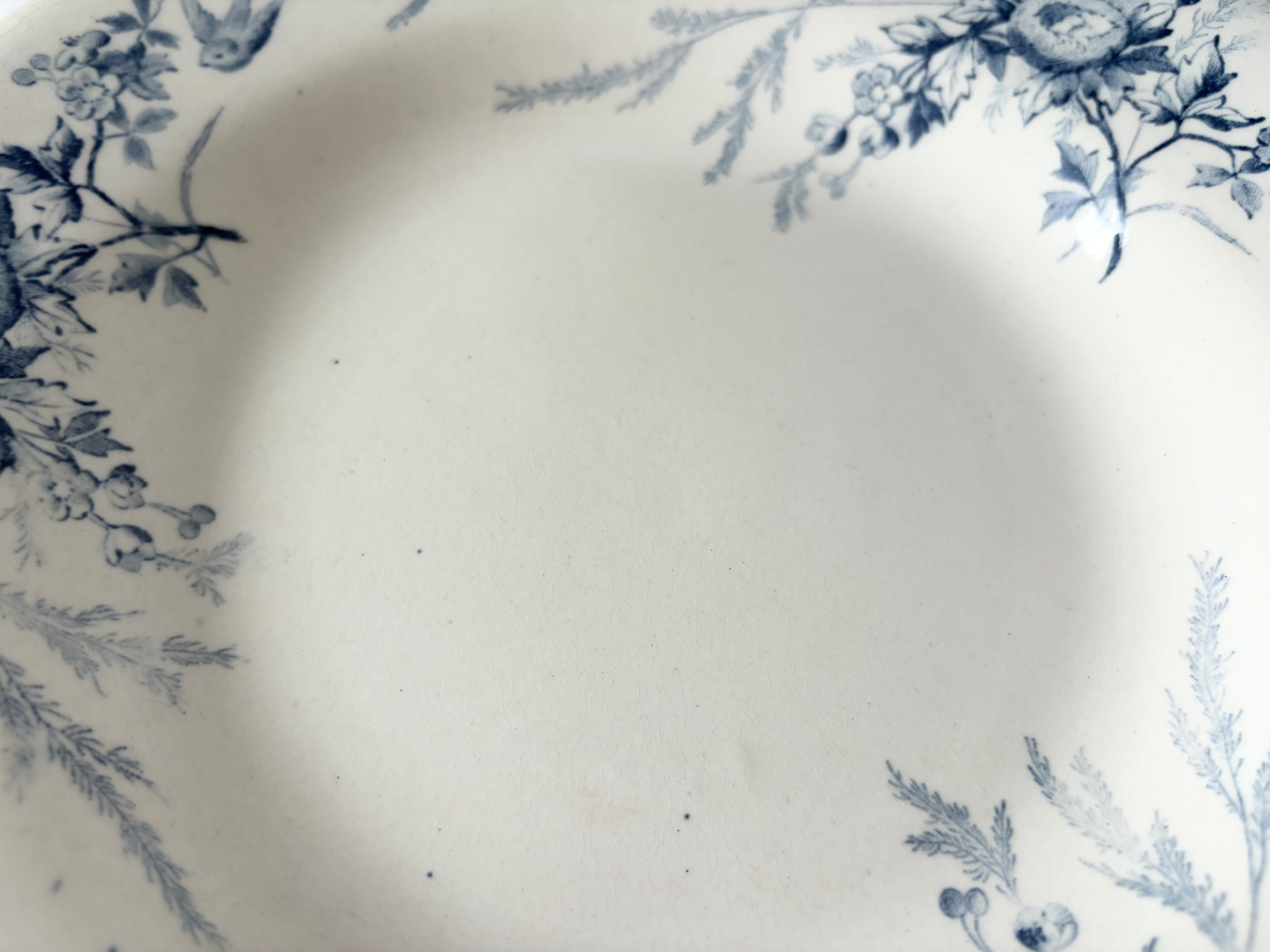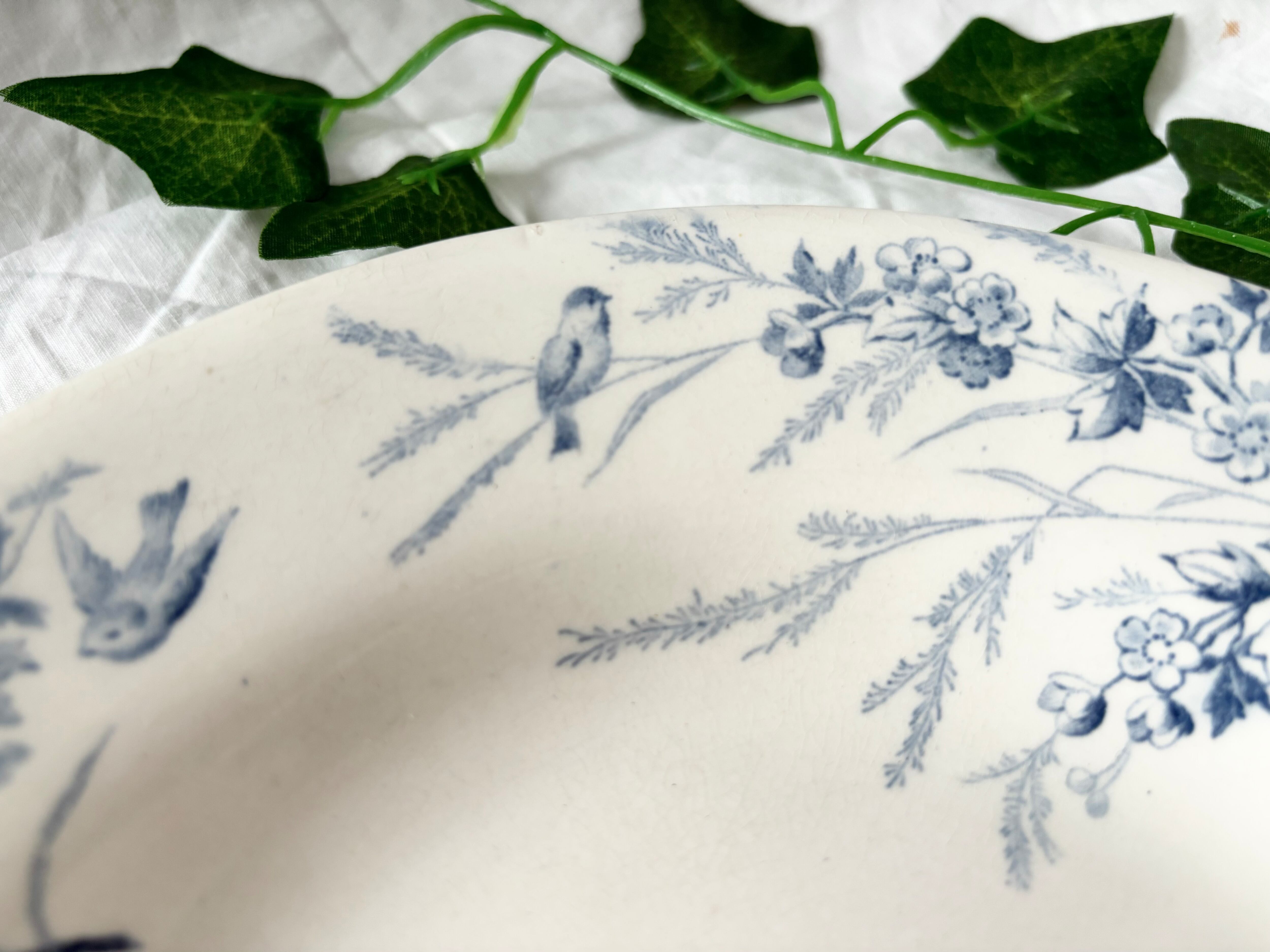刻印より1884-1895に製作されたと判別できるこのアイテムは、卵の羽化を待ち侘びて巣を取り巻く、小さな鳥達の春が藍色で濃く淡く描かれています。