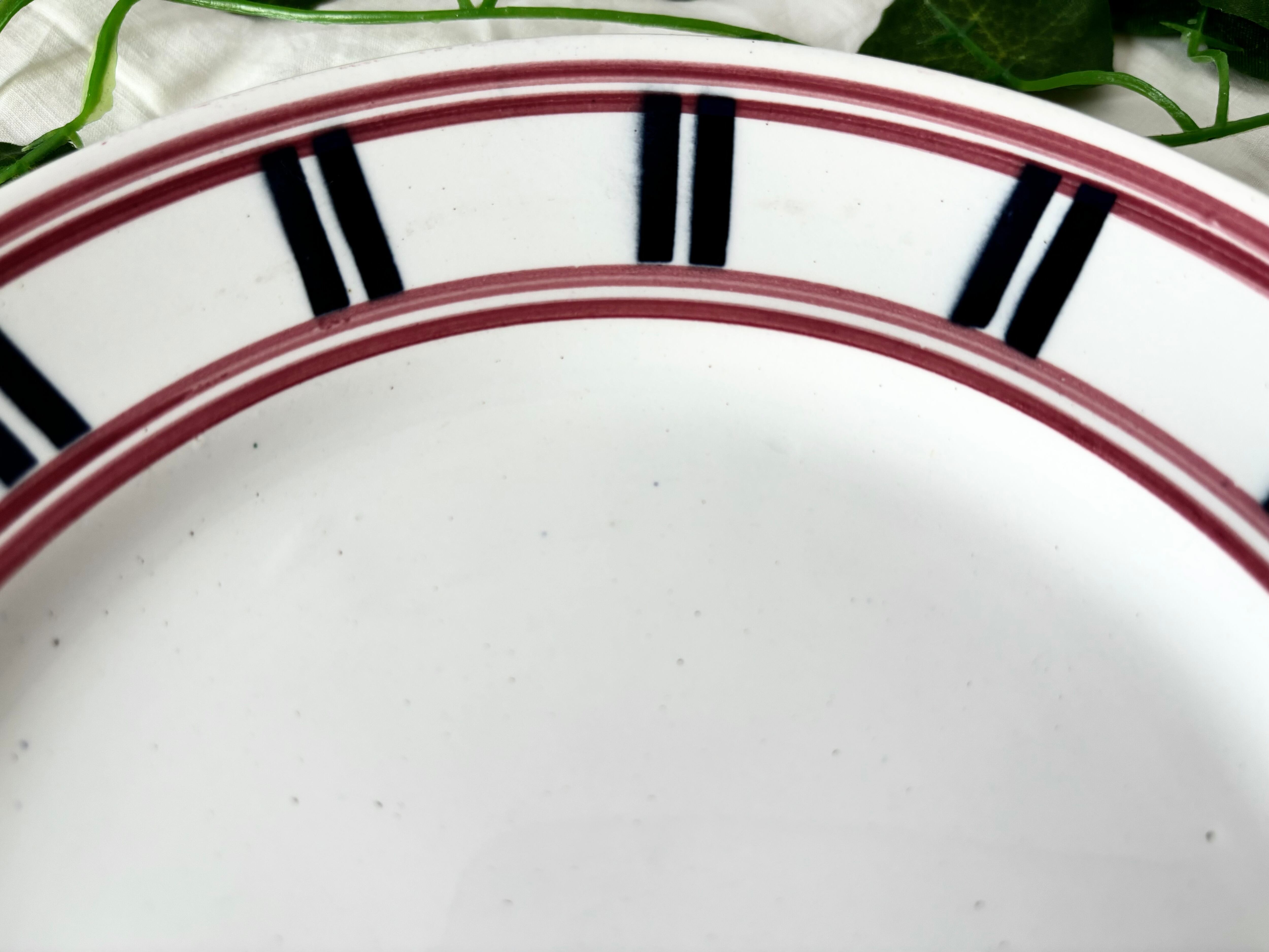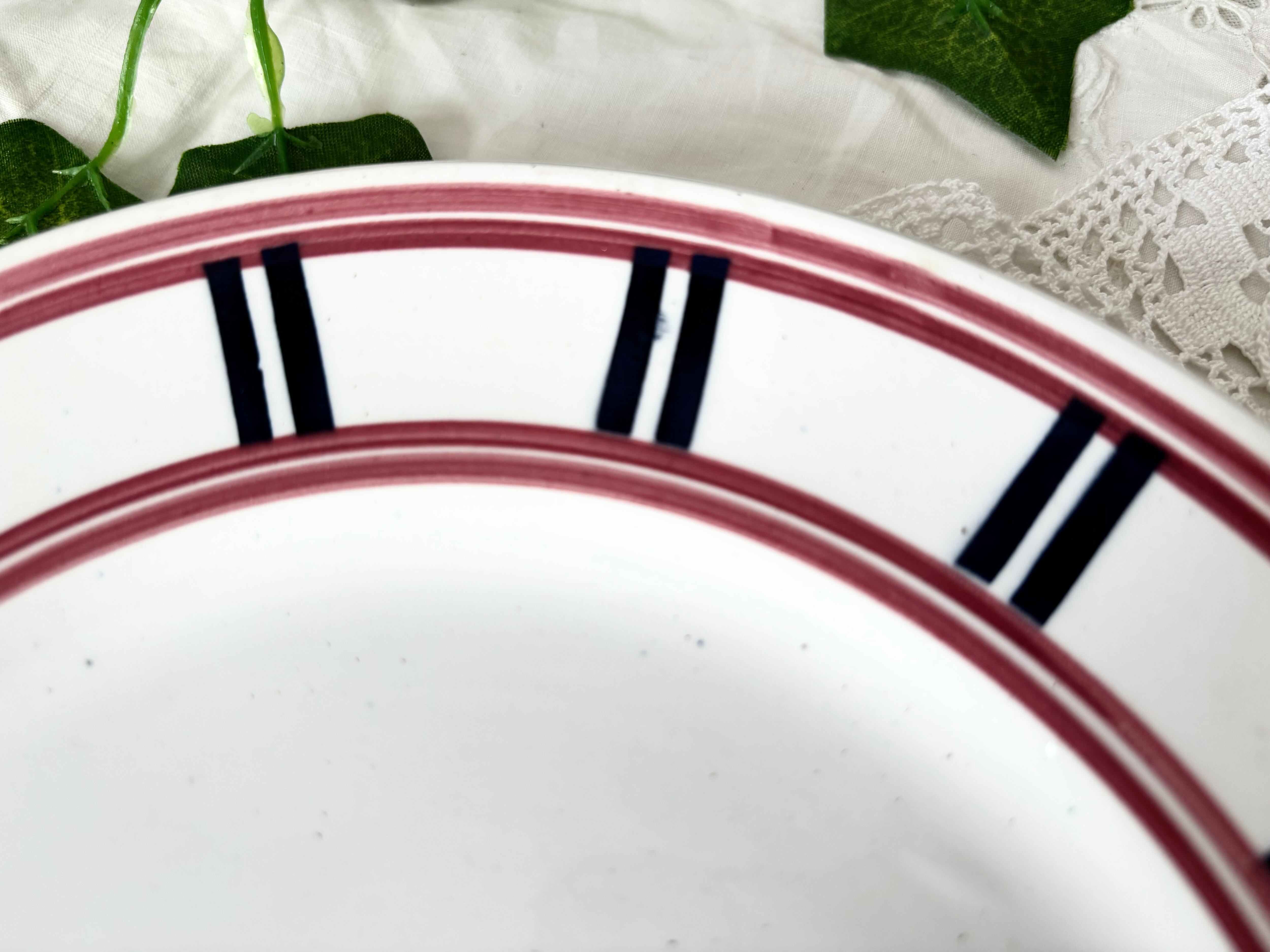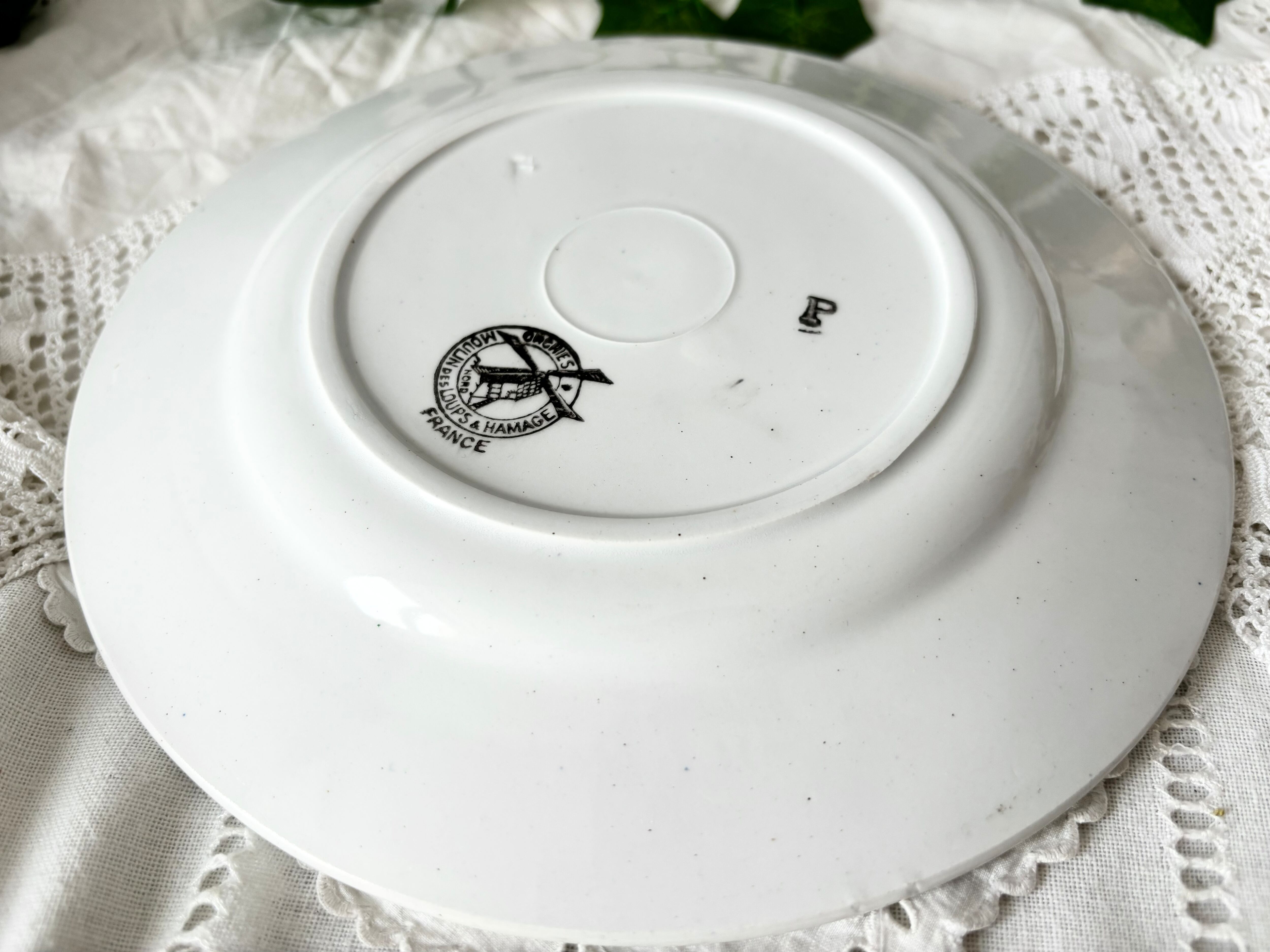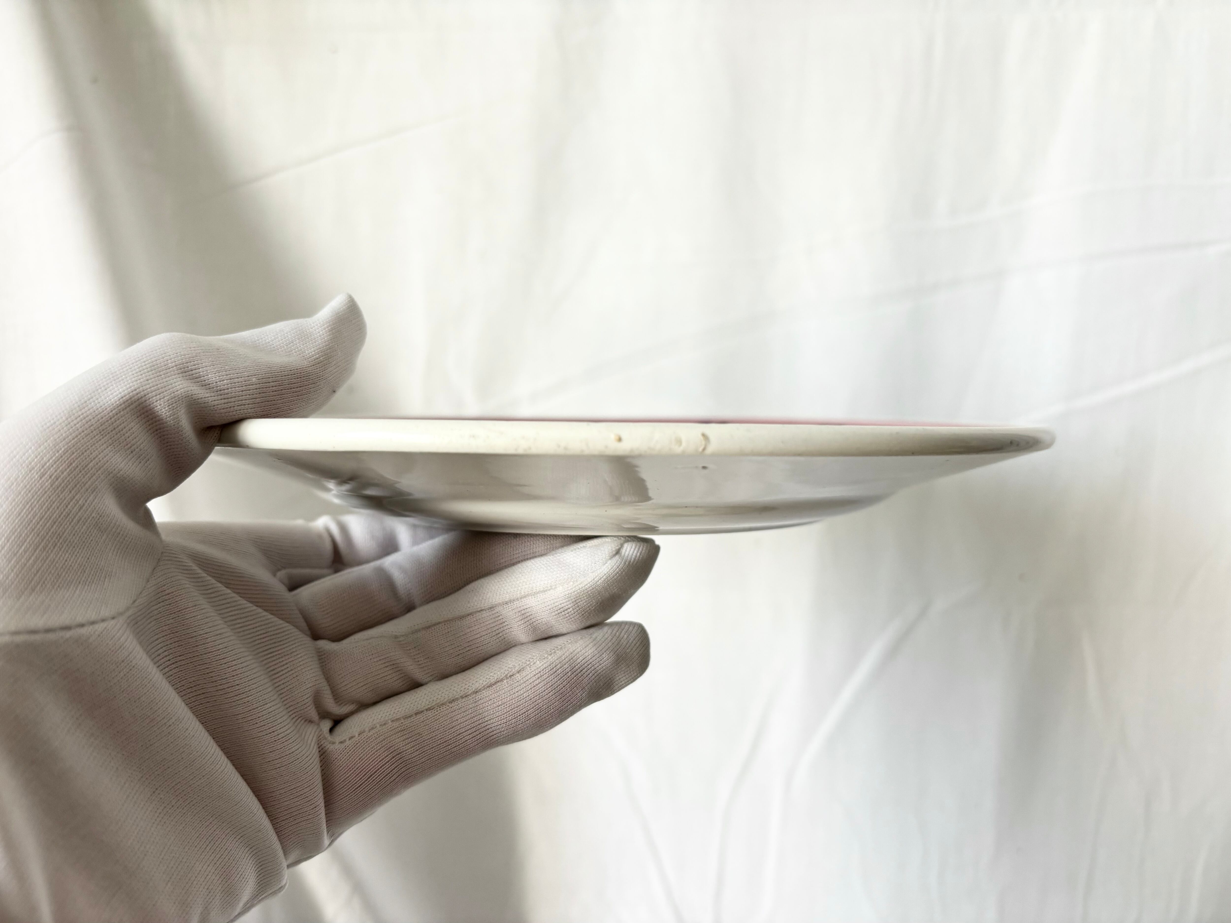 アイテムのコンディションとして、絵柄の掠れ、滲みがあり、色飛び、若しくは鉄粉の様な点々がお皿の表面に幾つかございます。横から見ると、フレームの端に制作時にできたと思われる、突起状の小さな傷と小傷がございます。また裏側にも鉄粉の様な点々と、小さな傷がございます。テールドフェールのエンボスの刻印は途中で立ち消えていますが、ムーランデルーの刻印はしっかりと印刷されていて、艶やかで、重厚感がしっかりとした、良いコンディションのお品といえます。