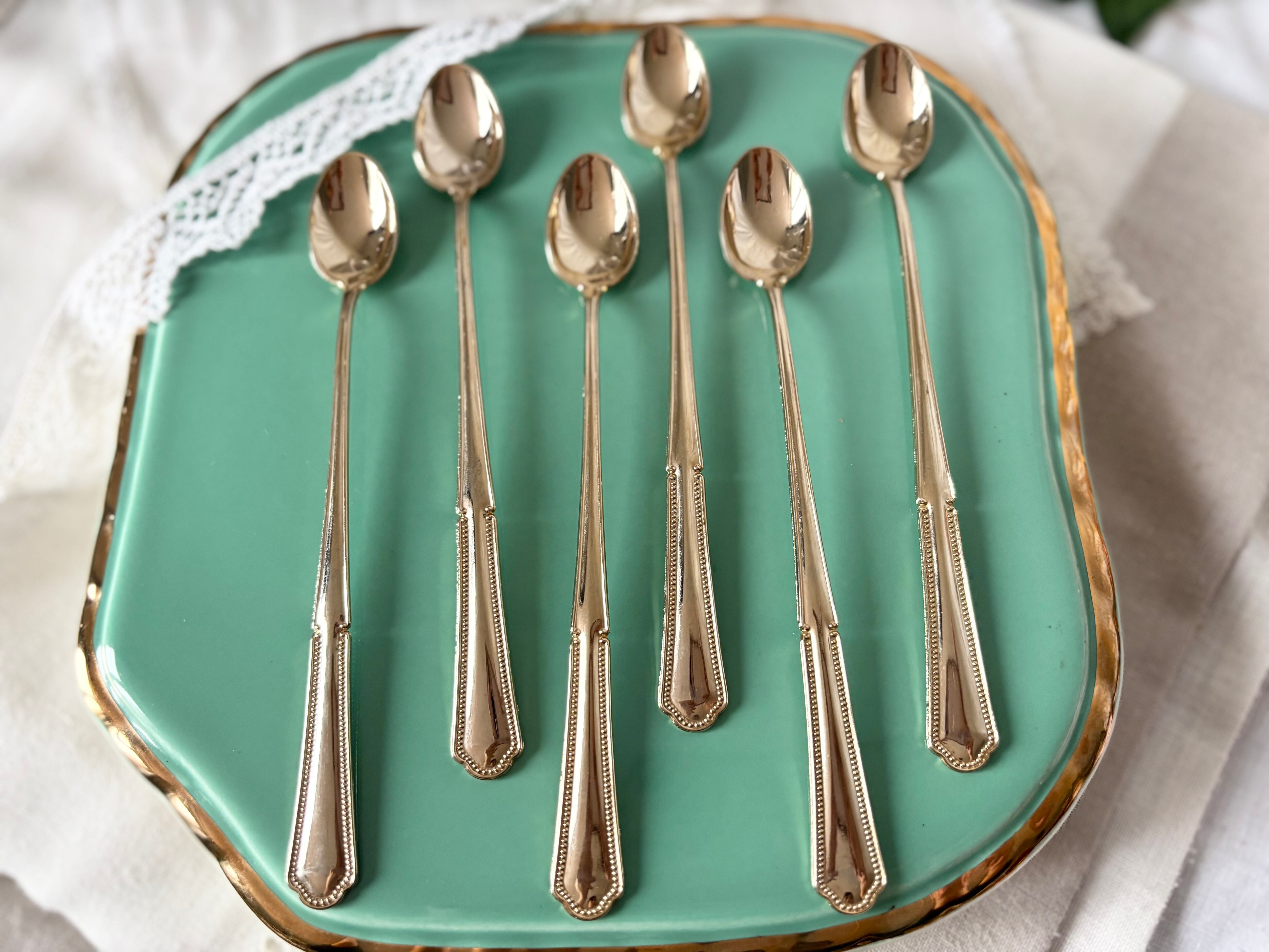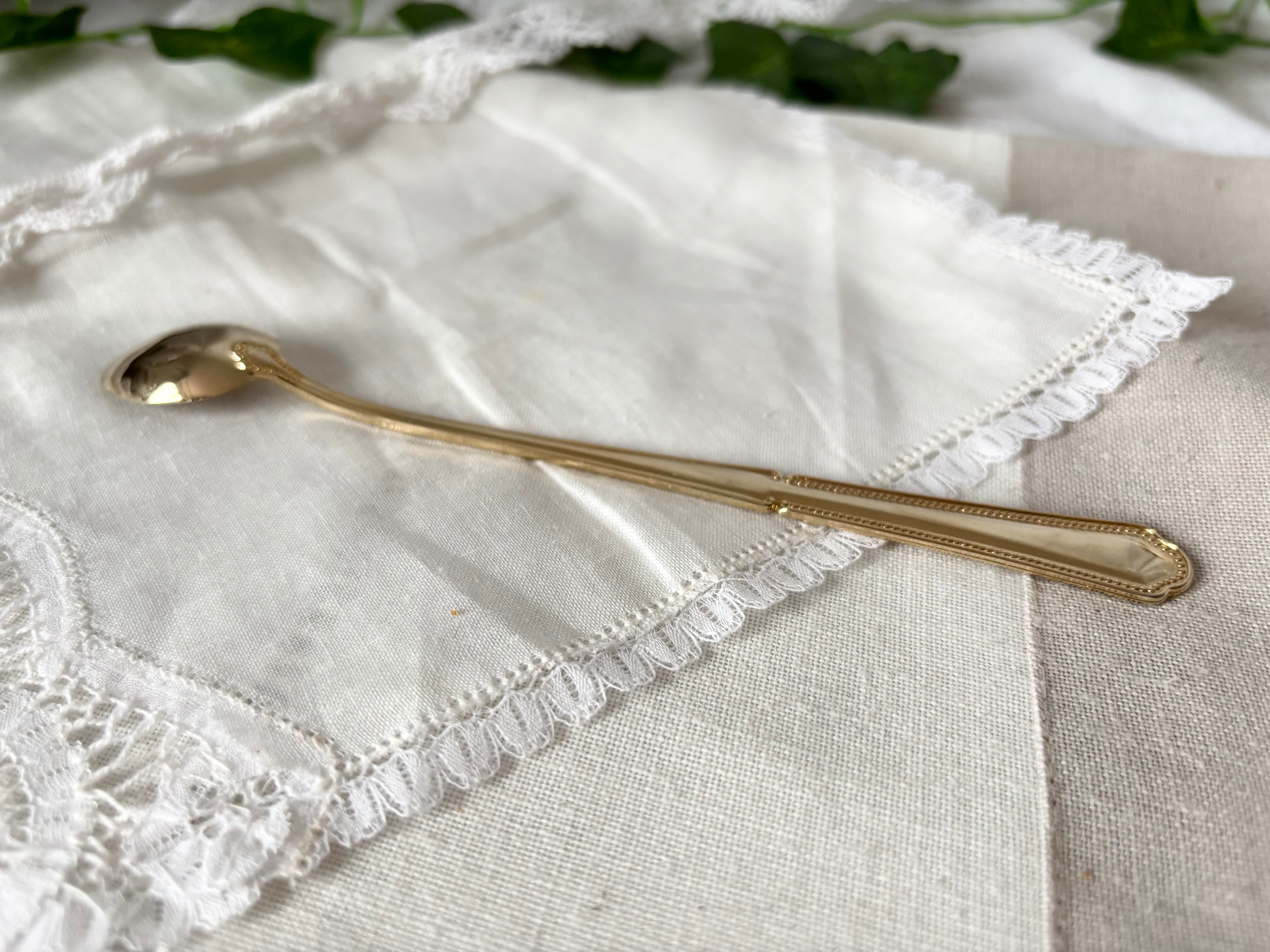 フェミニンな曲線と、ドットの縁飾りが可愛らしい、フランス70-80年代の金メッキのロングスプーン6本セットです。