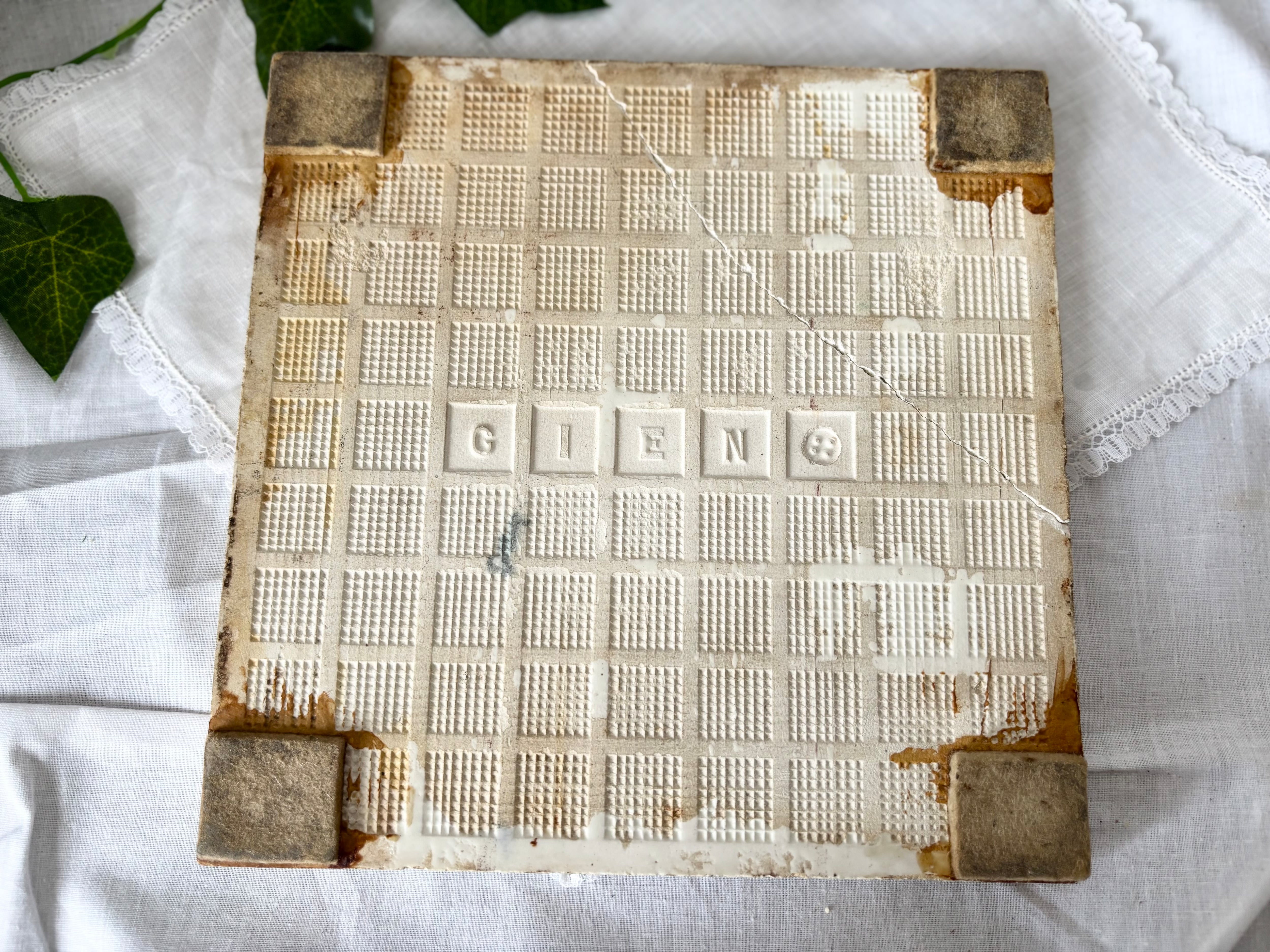 プレートを横から見ると、茶色く変色し、四隅が摩耗しています。恐らく鍋敷き等として利用されていたのか、裏側の四隅に、古く変色した滑り止めがついていて、接着剤の後で、茶色い変色が多くみられます。裏にGIENの刻印がございます。