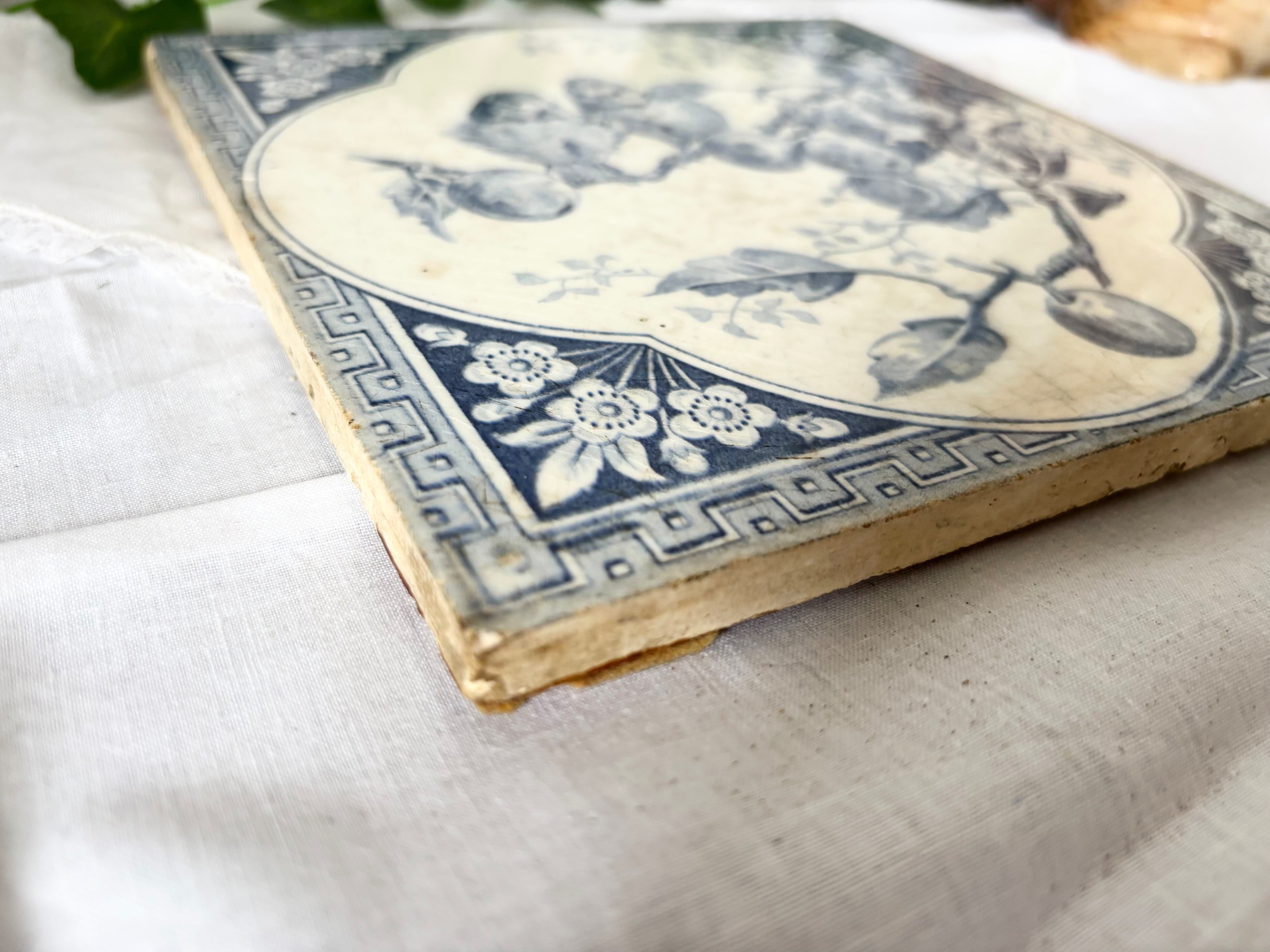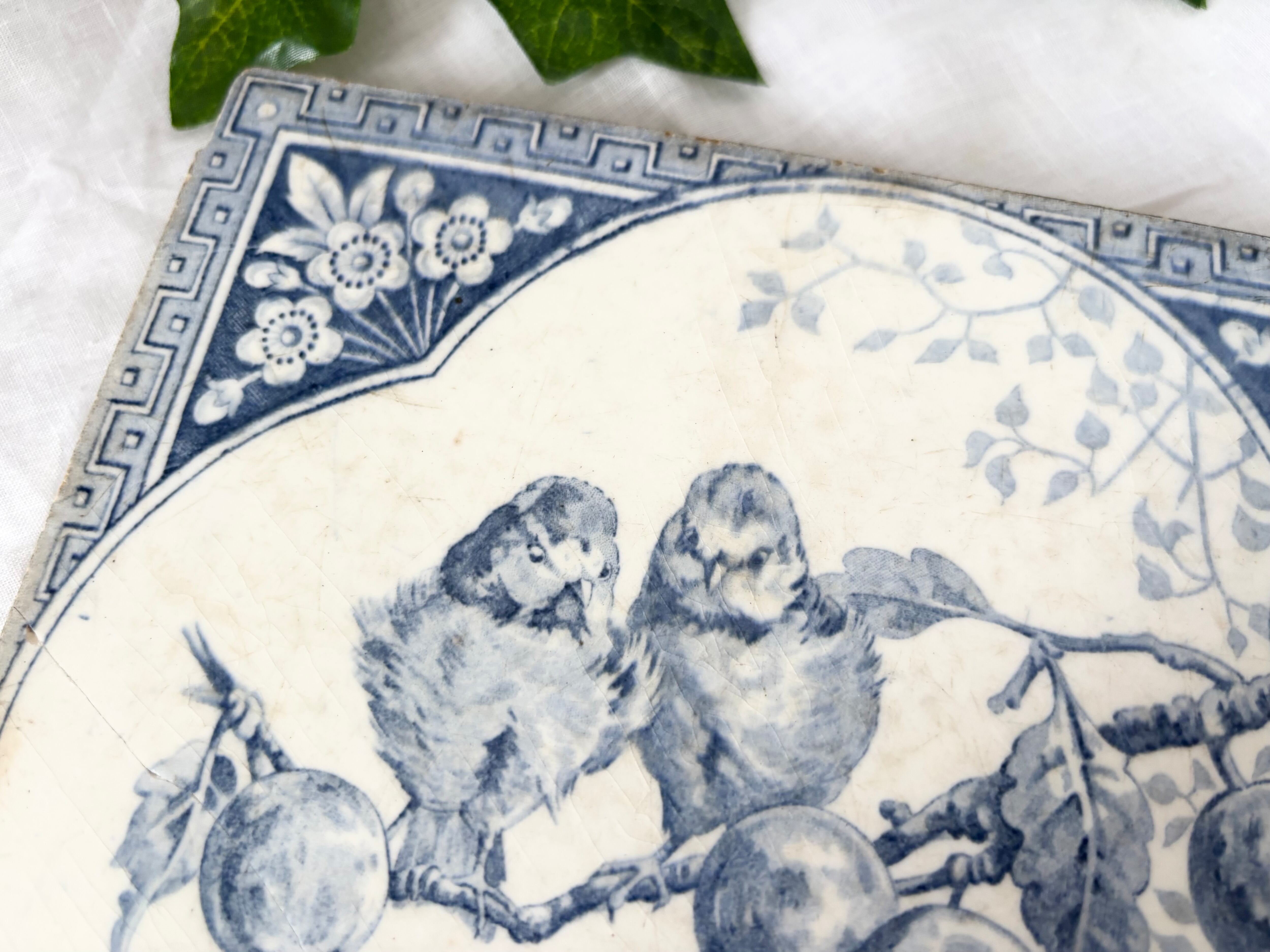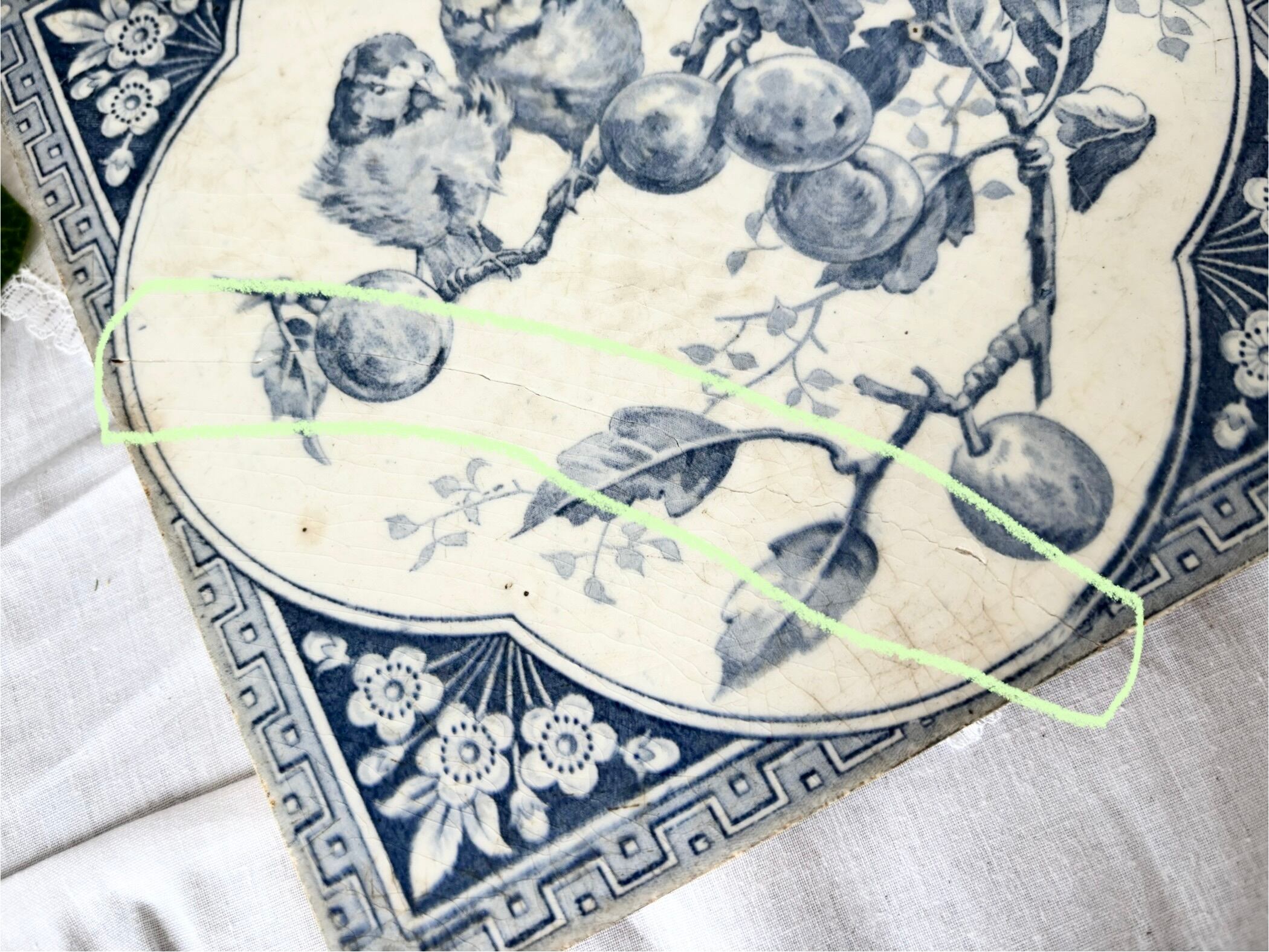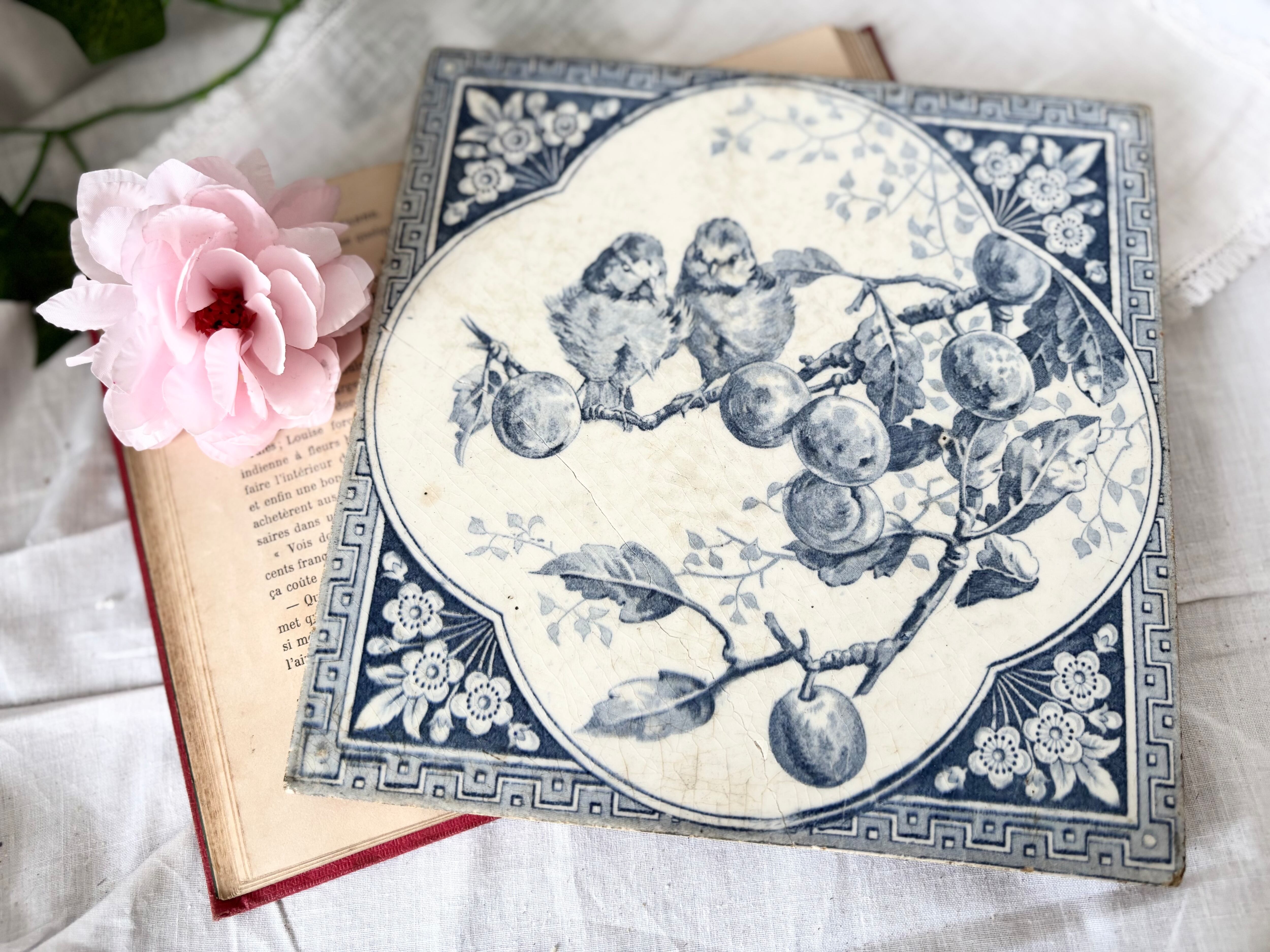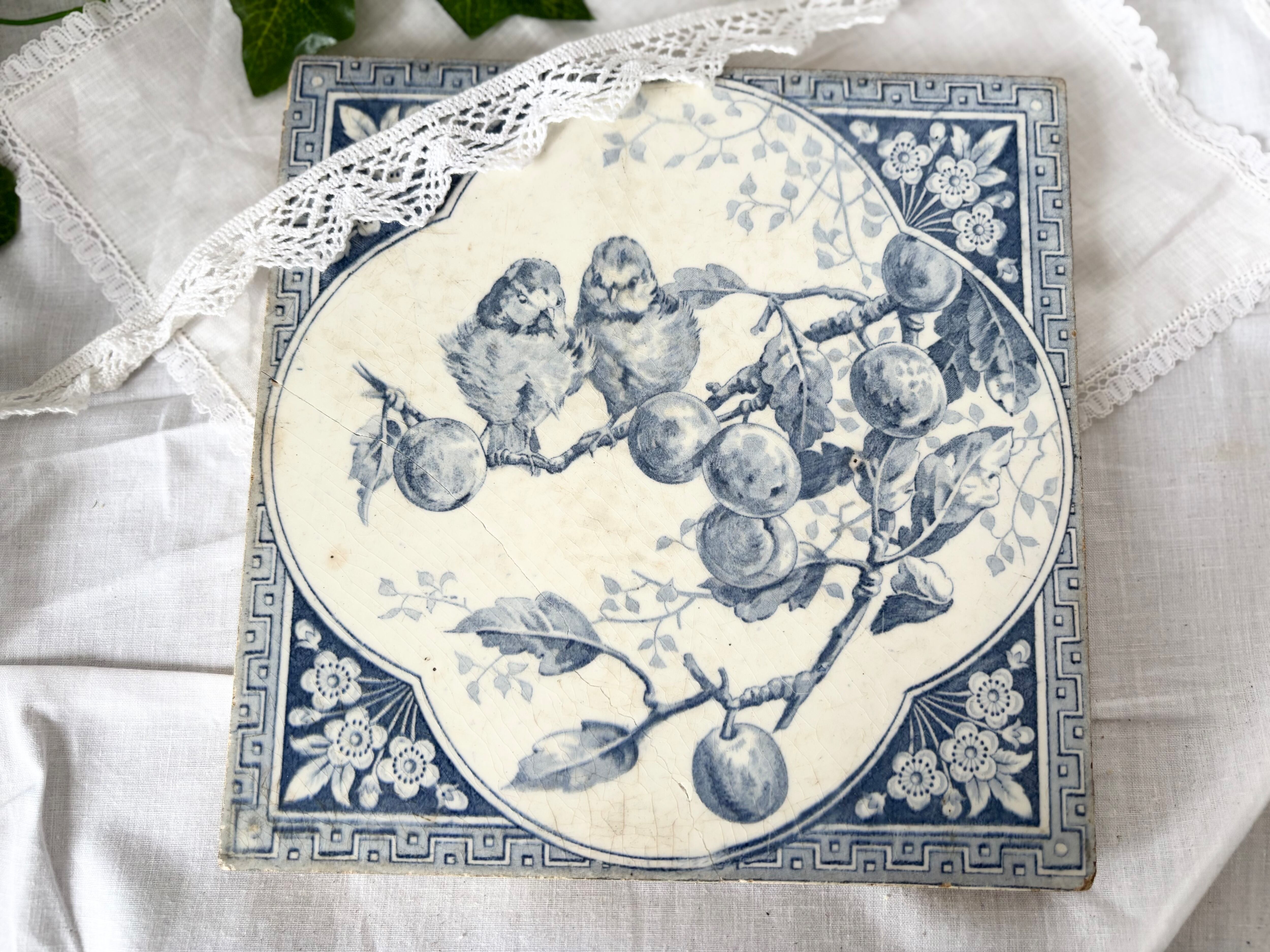 Gien / Ceramic tile with Visible Repair Marks from Breakage / Birds and Mirabelle tree / shabby chic / France / Antique / ジアン/ 鳥 /セラミックタイル /