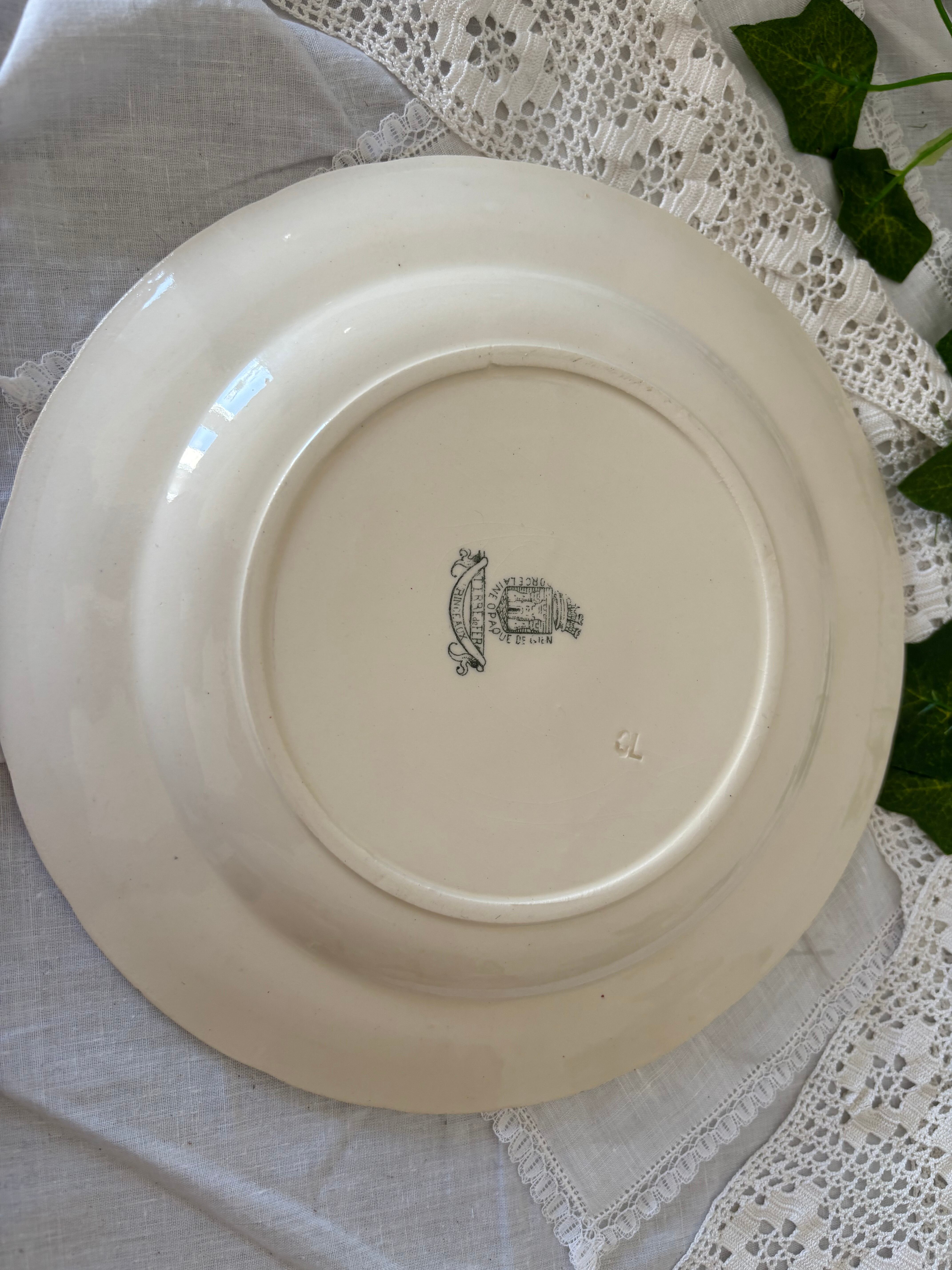 お皿全体に貫入があり、軽いカトラリー跡と、極一分に軽い変色があります。絵柄と刻印に掠れや途切れがございます。表面の中央付近の蔦の先に、ぼんやりと、色飛びのような、ライン状の変色がございます。リムの端に小さな傷と、横から見ると、もう一箇所リムに小さな欠けがございますが、艶やかで、アンティークとして、美しい形状を保っているお品と言えます。