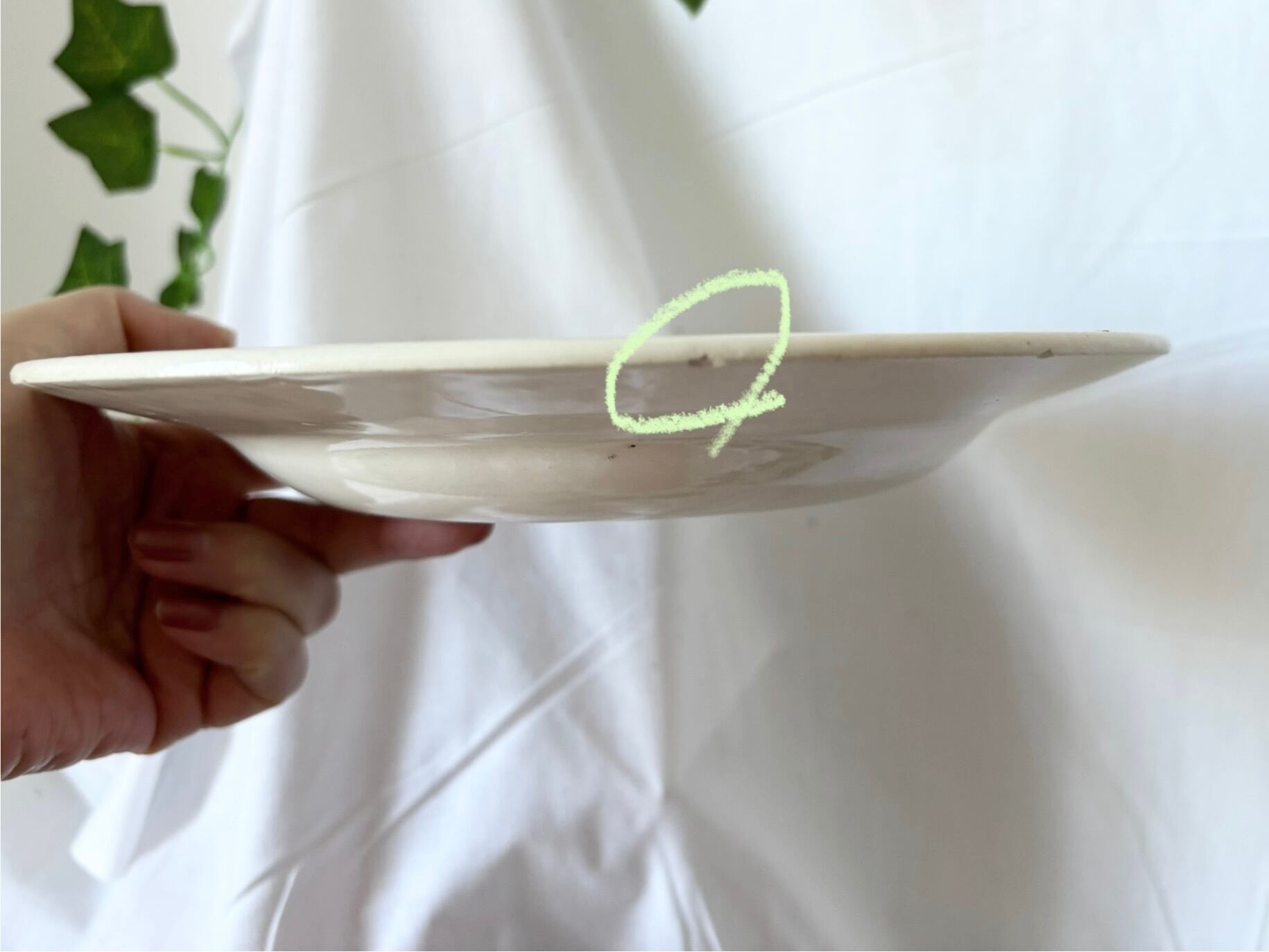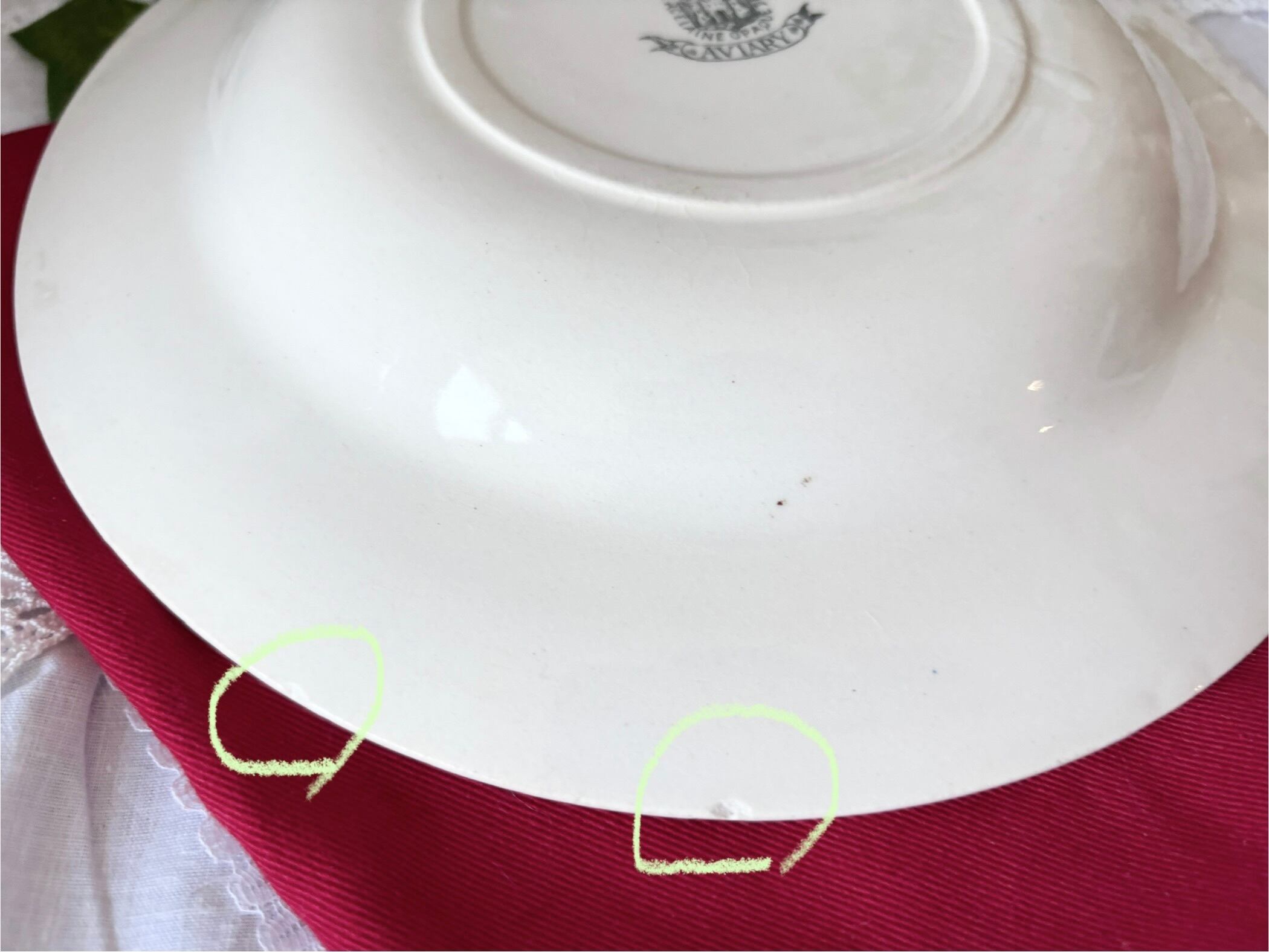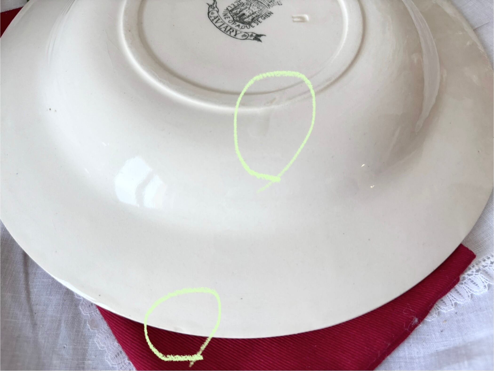 アイテムのコンディションとして、カトラリー跡と、絵柄と刻印の掠れがございます。また、裏から見ると、縁に二箇所の小さな傷と、一箇所凹み傷がございます。裏にエナメルの不均一で、高低差がある部分もございますが、大変艶やかで、アンティークとして良い状態のお品といえます。