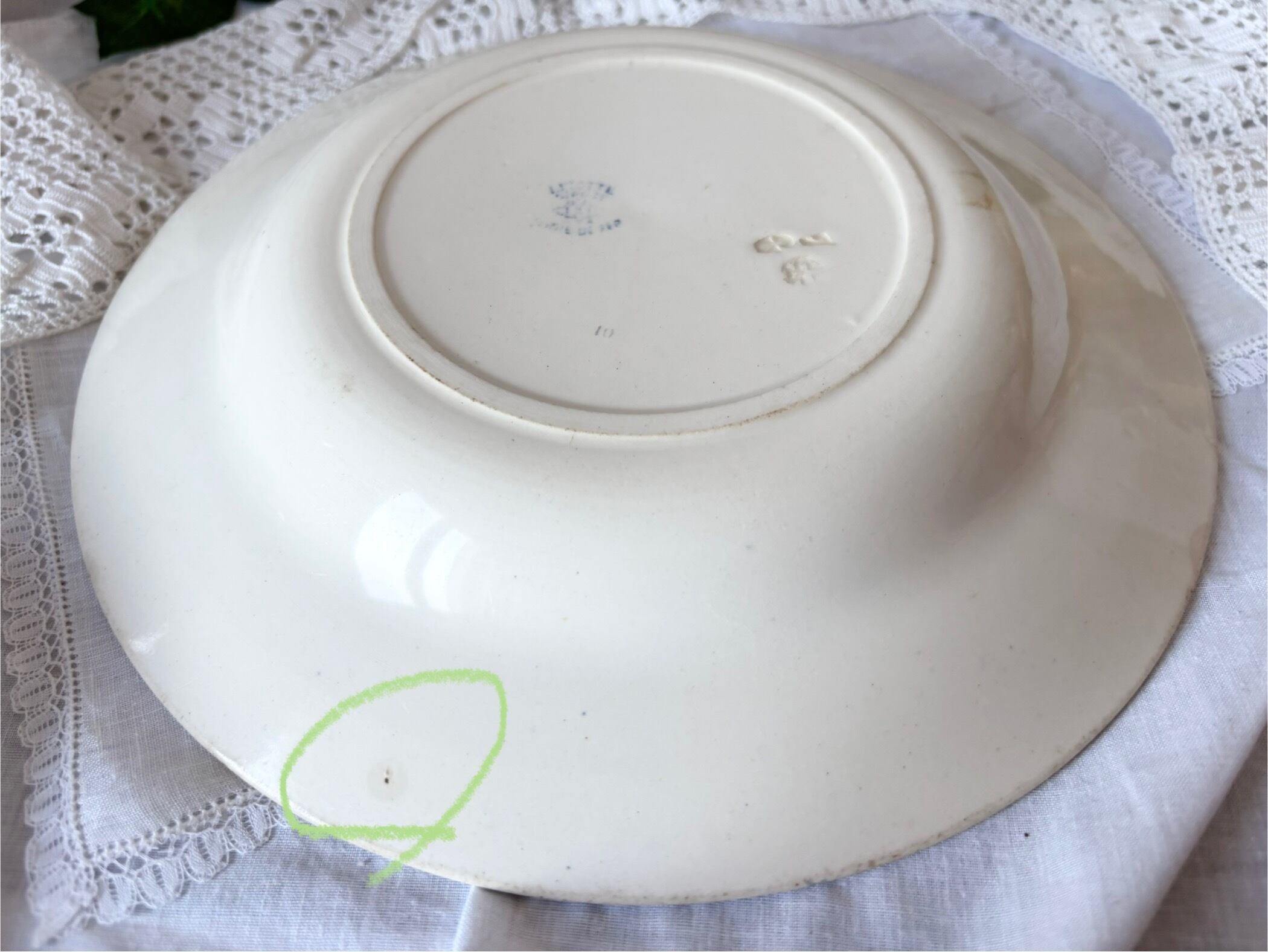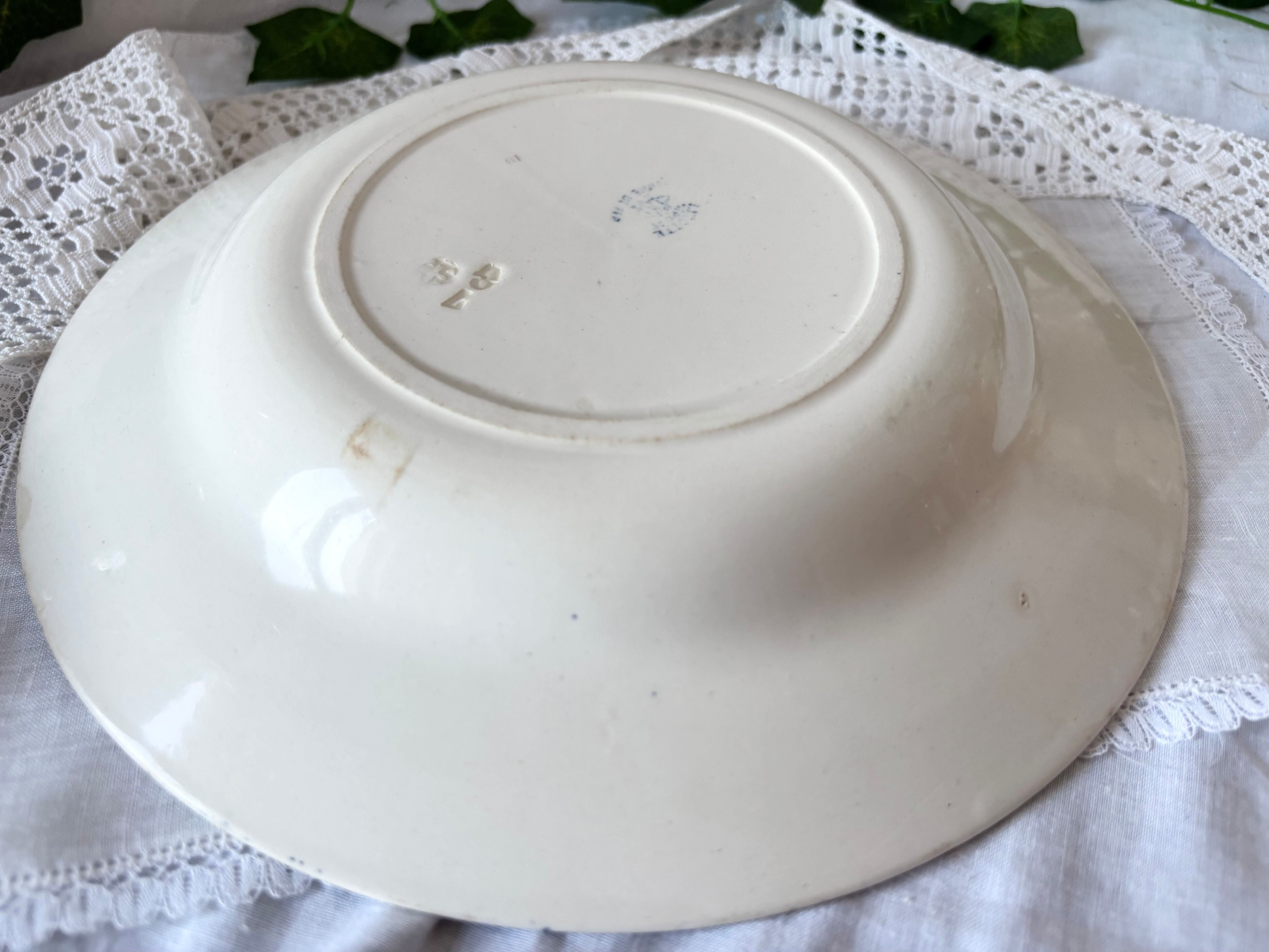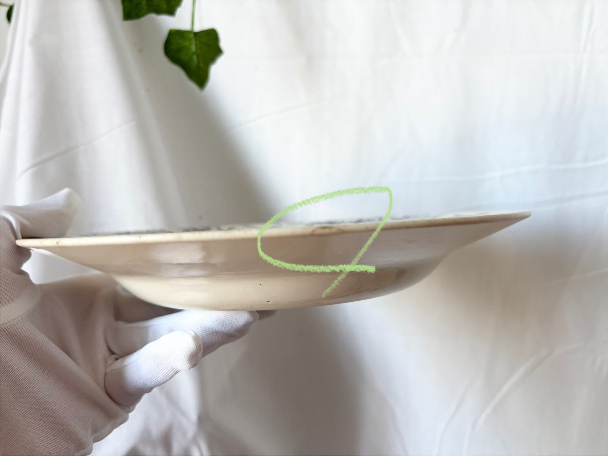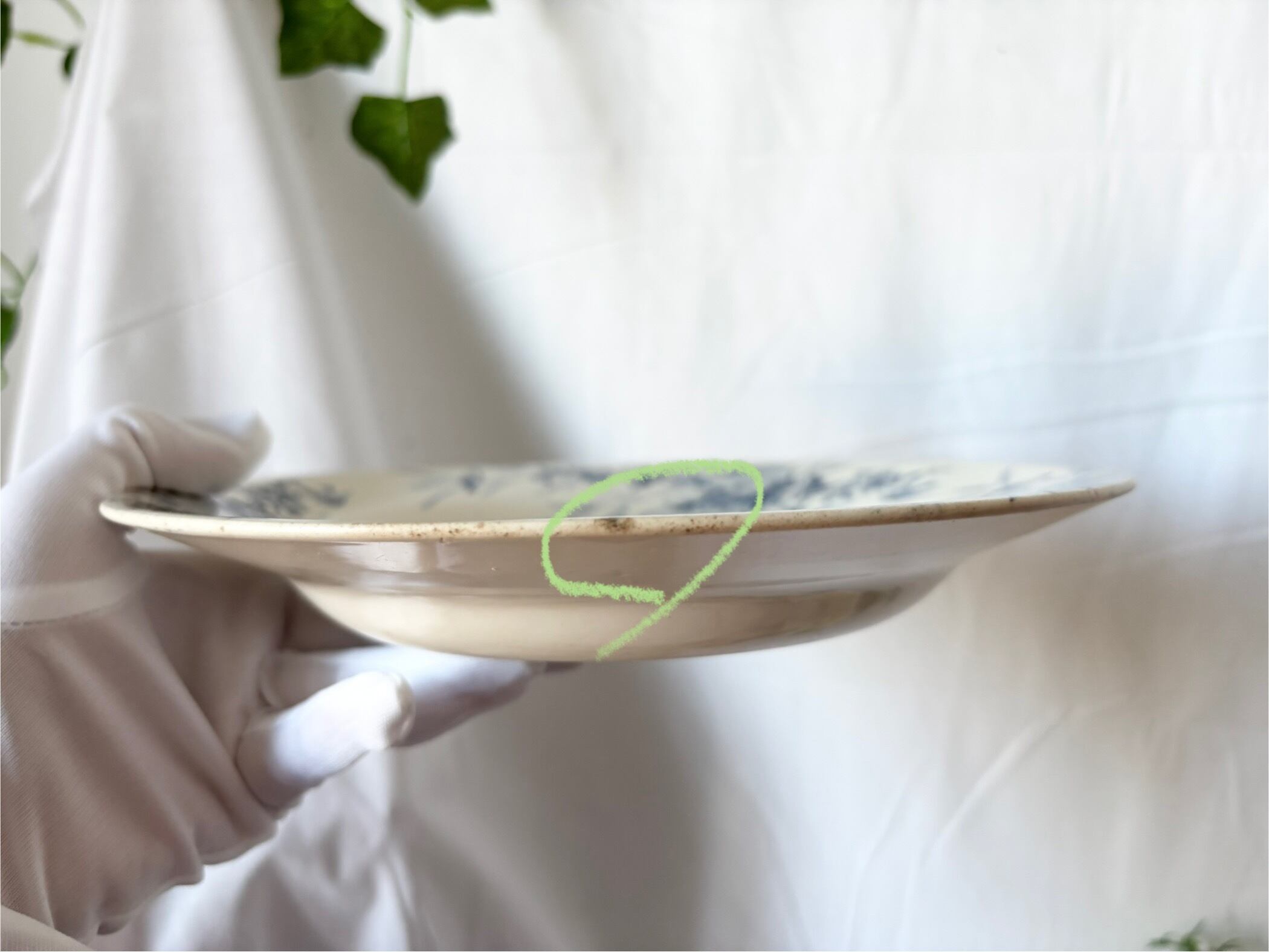 アイテムのコンディションとして、カトラリー跡があり、器の底に変色を伴った小さな傷と、リムの縁にシミと、シミを伴った傷がございます。絵柄に滲みや掠れがございます。