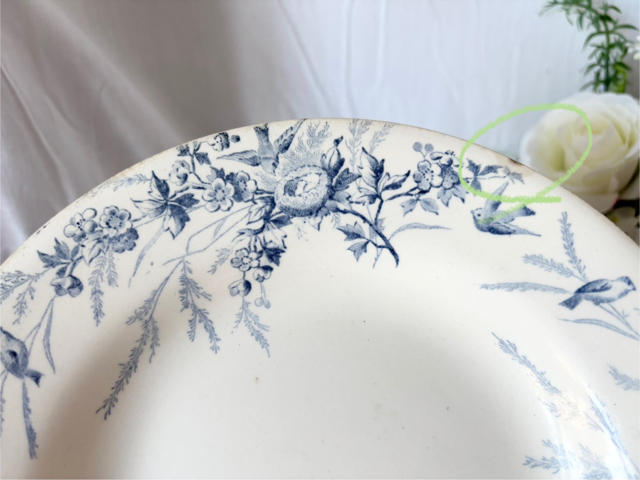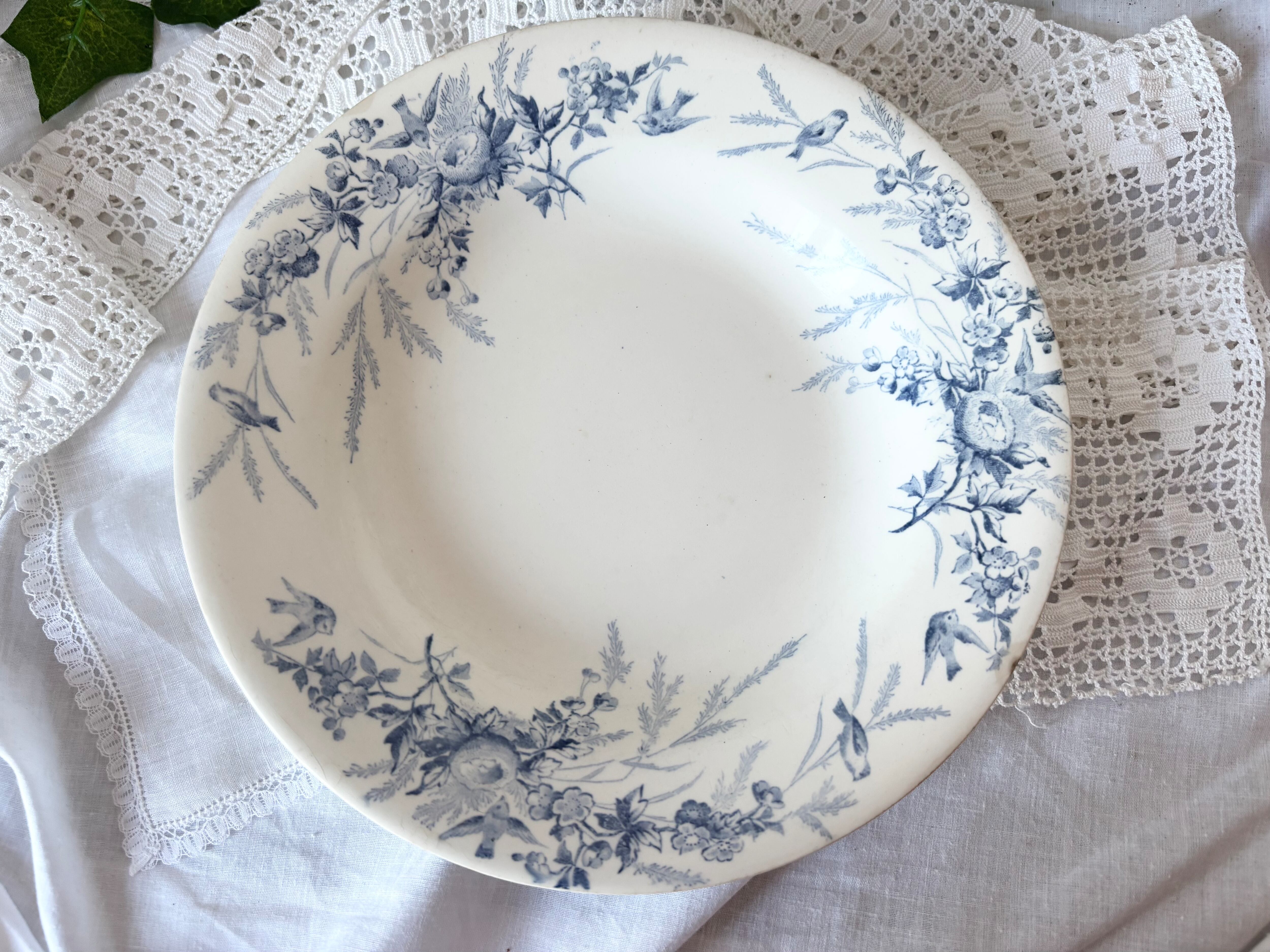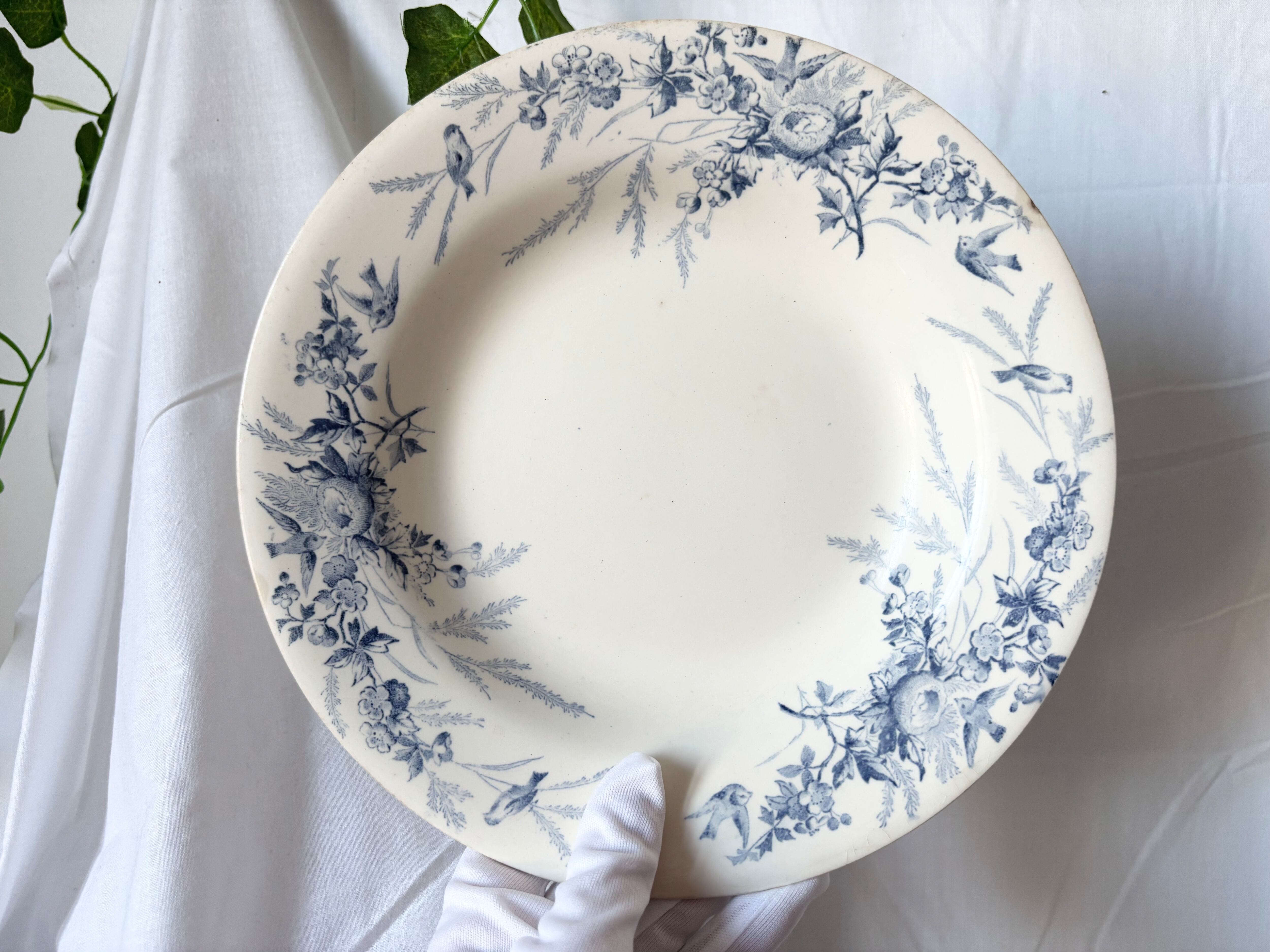 刻印より1884-1895に製作されたと判別できるこのアイテムは、卵の羽化を待ち侘びて巣を取り巻く、小さな鳥達の春が藍色で濃く淡く描かれています。