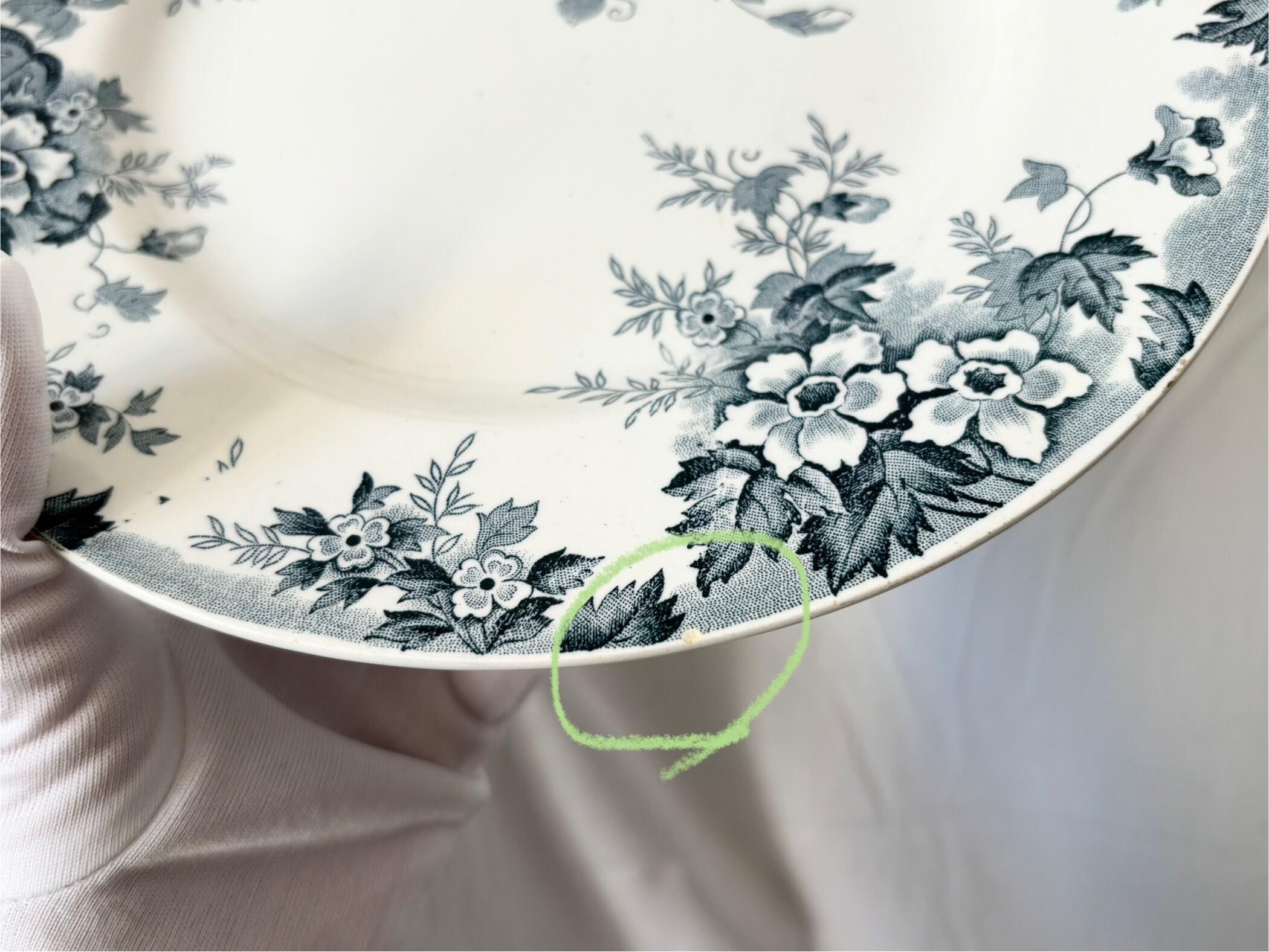 アイテムのコンディションとして、軽いカトラリー跡と、薄く小さなシミがお皿の中央部に点々とございます。リムに多少の色褪せと、リムの端に一箇所小傷がございます。横から見ると色飛びと小傷がございます。裏側のリムが薄く茶色っぽく変色しており、エナメルの不均一で高低差がある部分がございます。所々色飛びと、絵柄と刻印に掠れもございますが、使用感が低く、艶やかで、アンティークのお品として良い状態といえます。