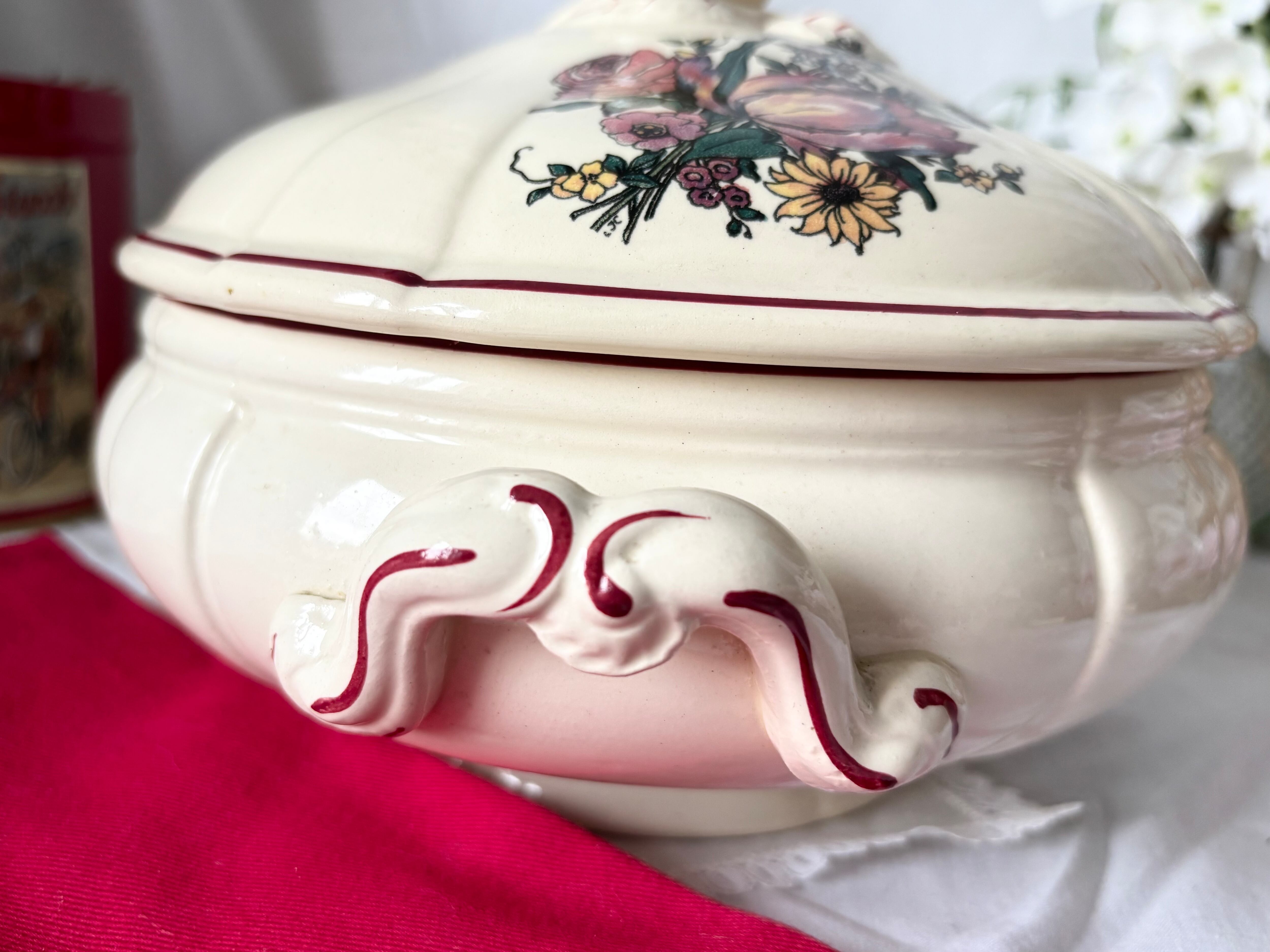優しいアイボリーの陶器の表面が美しく輝き、ワインレッドのアクセントに、チューリップや薔薇のブーケが華やかです。丸く可愛らしい蓋のポンポンに、ハンドルにも曲線の彫刻が施されています。