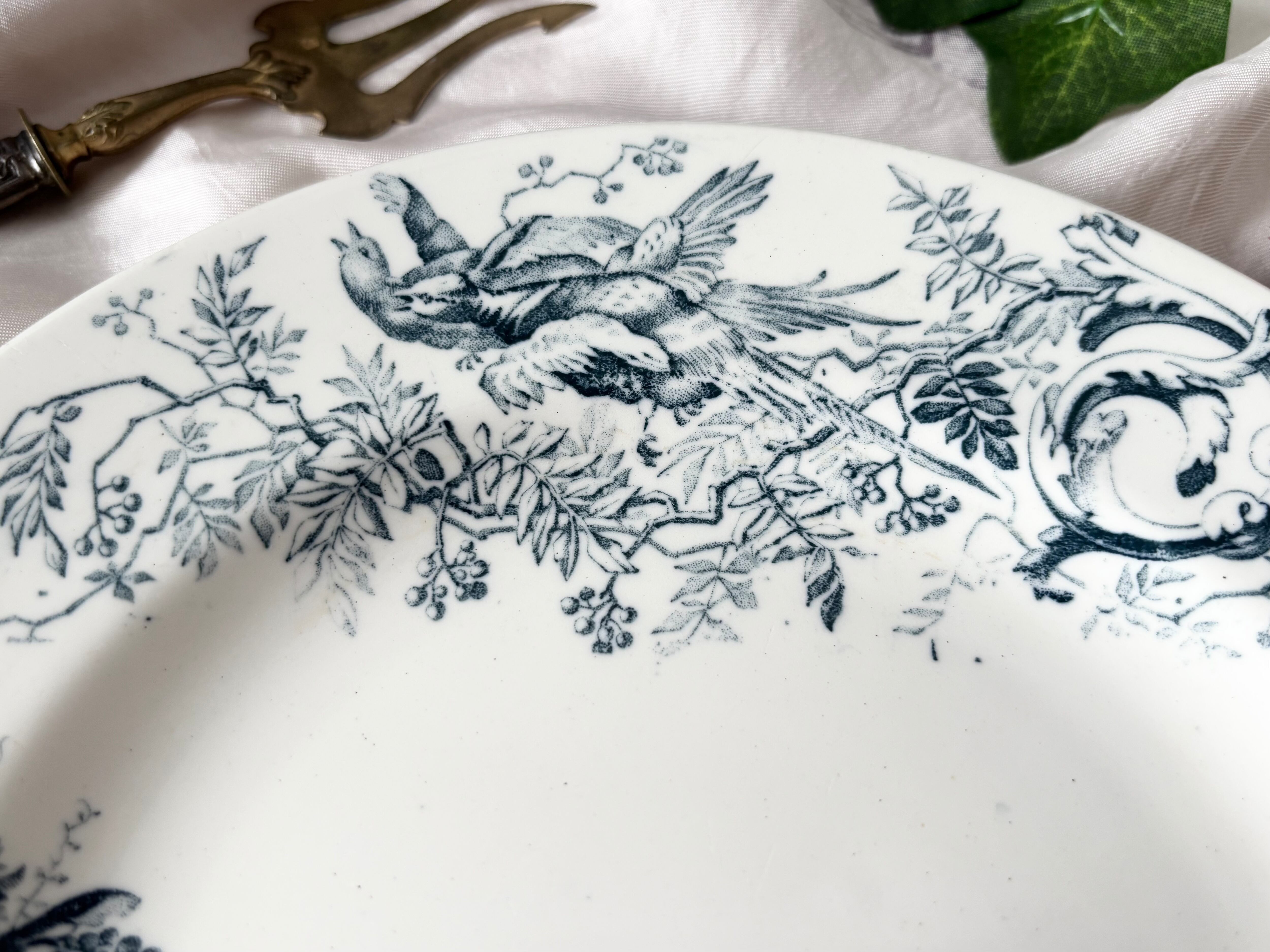 アイテムのコンディションとして、軽いカトラリー跡と薄く小さなシミ、小傷と多少の色飛びが認められます。絵柄と刻印に掠れもございますが、艶やかで、大変良い状態のお品と言えます。