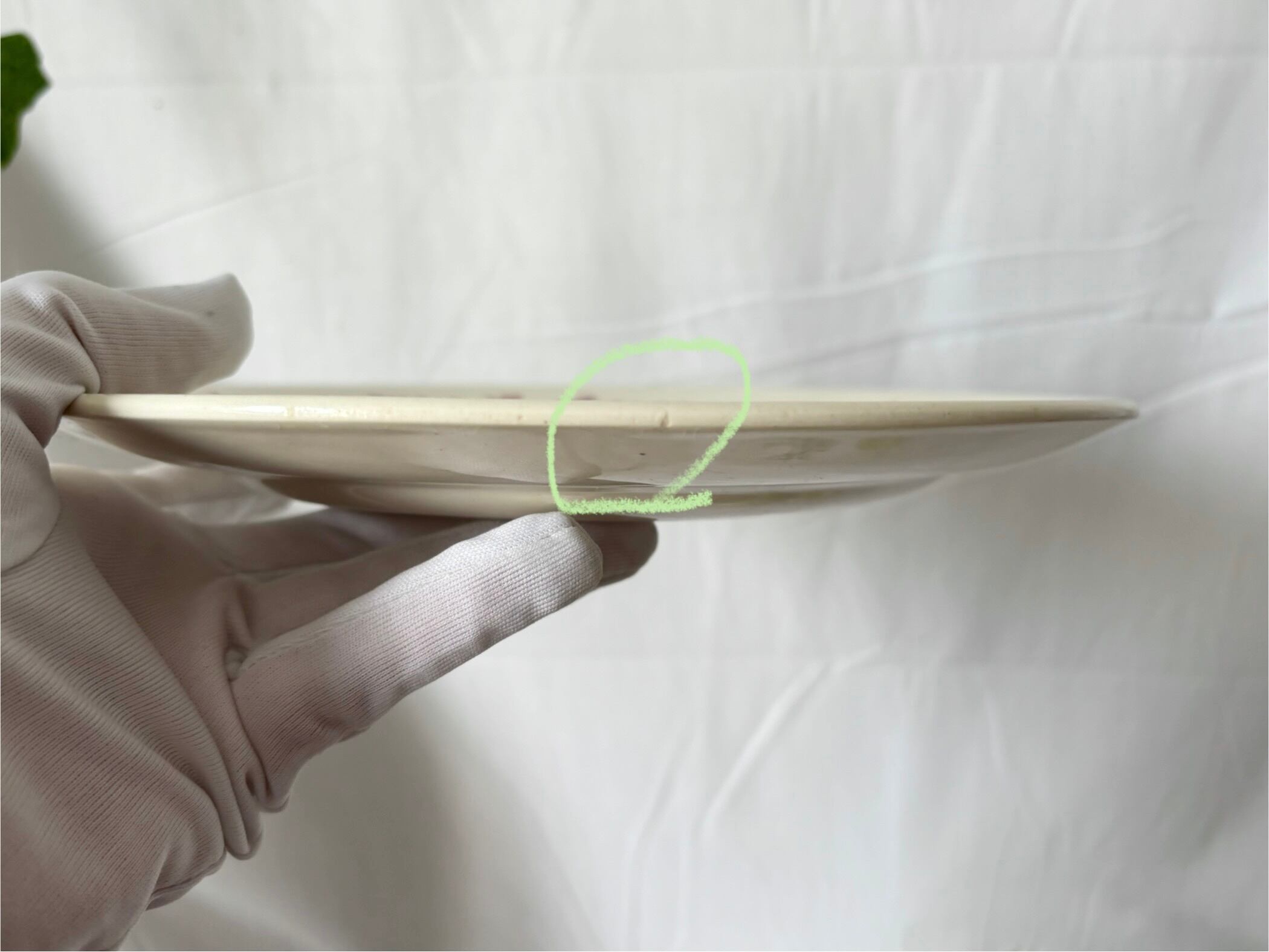 アイテムのコンディションとして、お皿中央にややきいろがかった、ぼんやりとした色褪せを認められます。お皿全体に美しくクレイジングが広がり、表面にカトラリー跡と色飛びがございます。リムに一箇所小傷がございます。また、お皿の端にエナメルの塗り残しがございます。絵柄と刻印に掠れもございますが、アンティークのお品として、大変艶やかで、良い状態といえます。